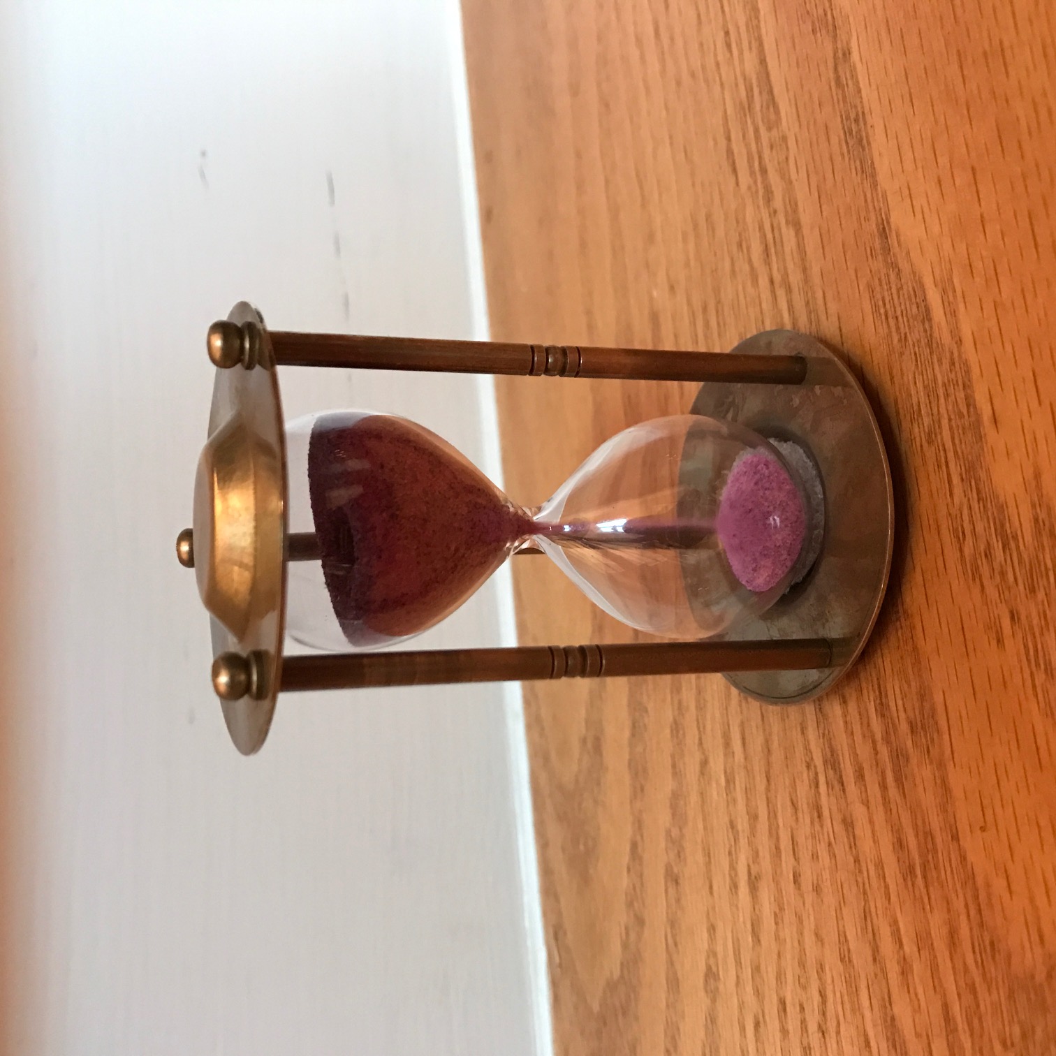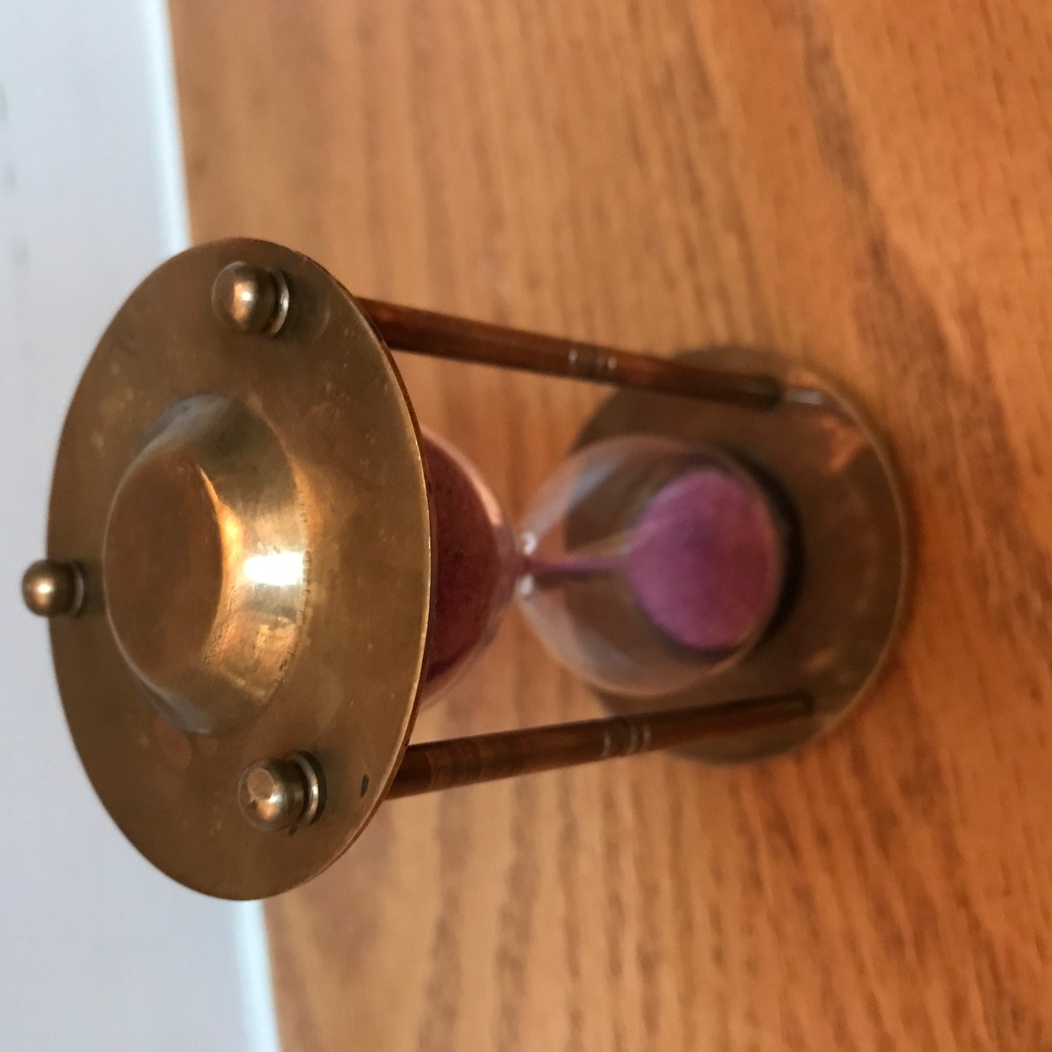 Small brass sand timer with a rose quartz sand filling. The timer measures one minute.