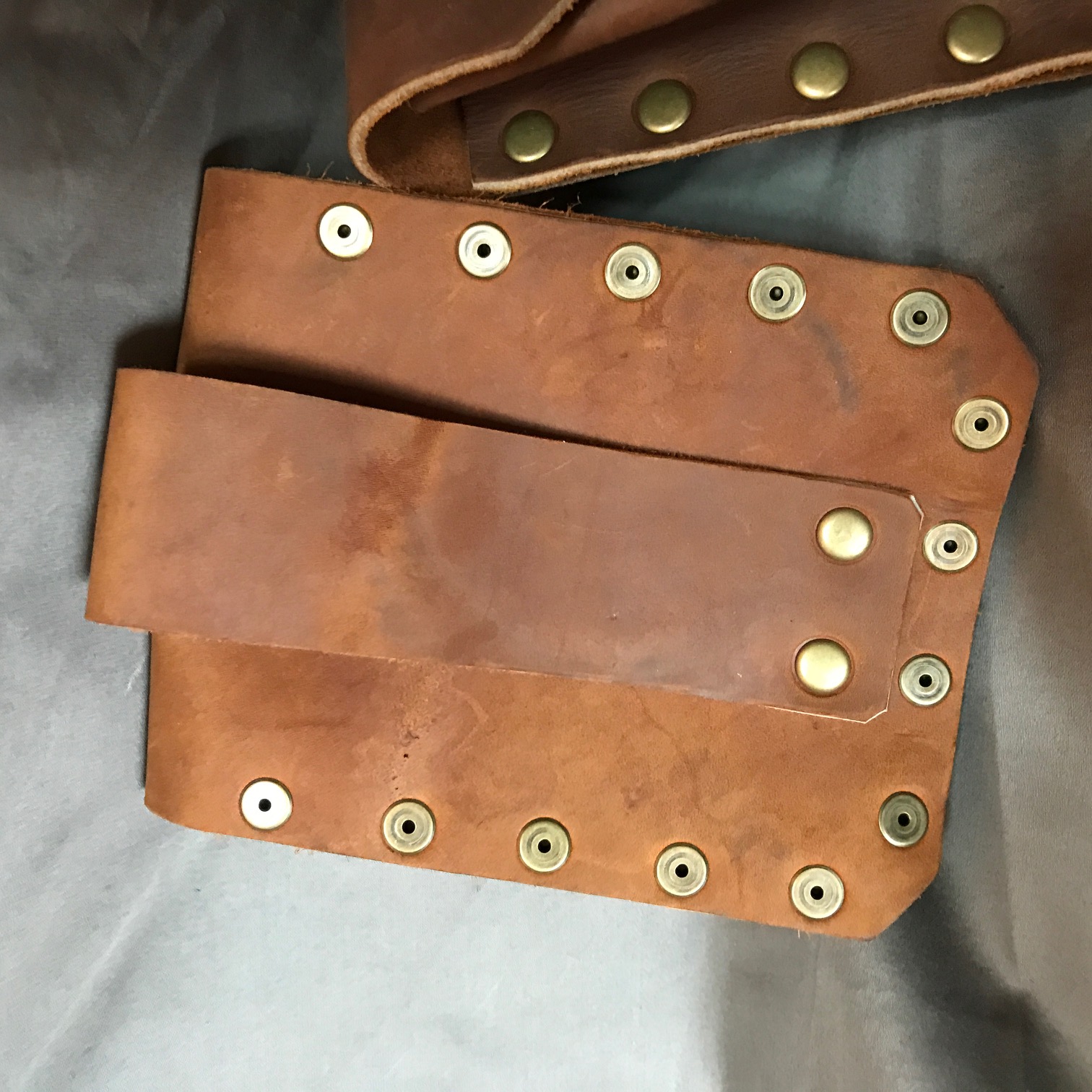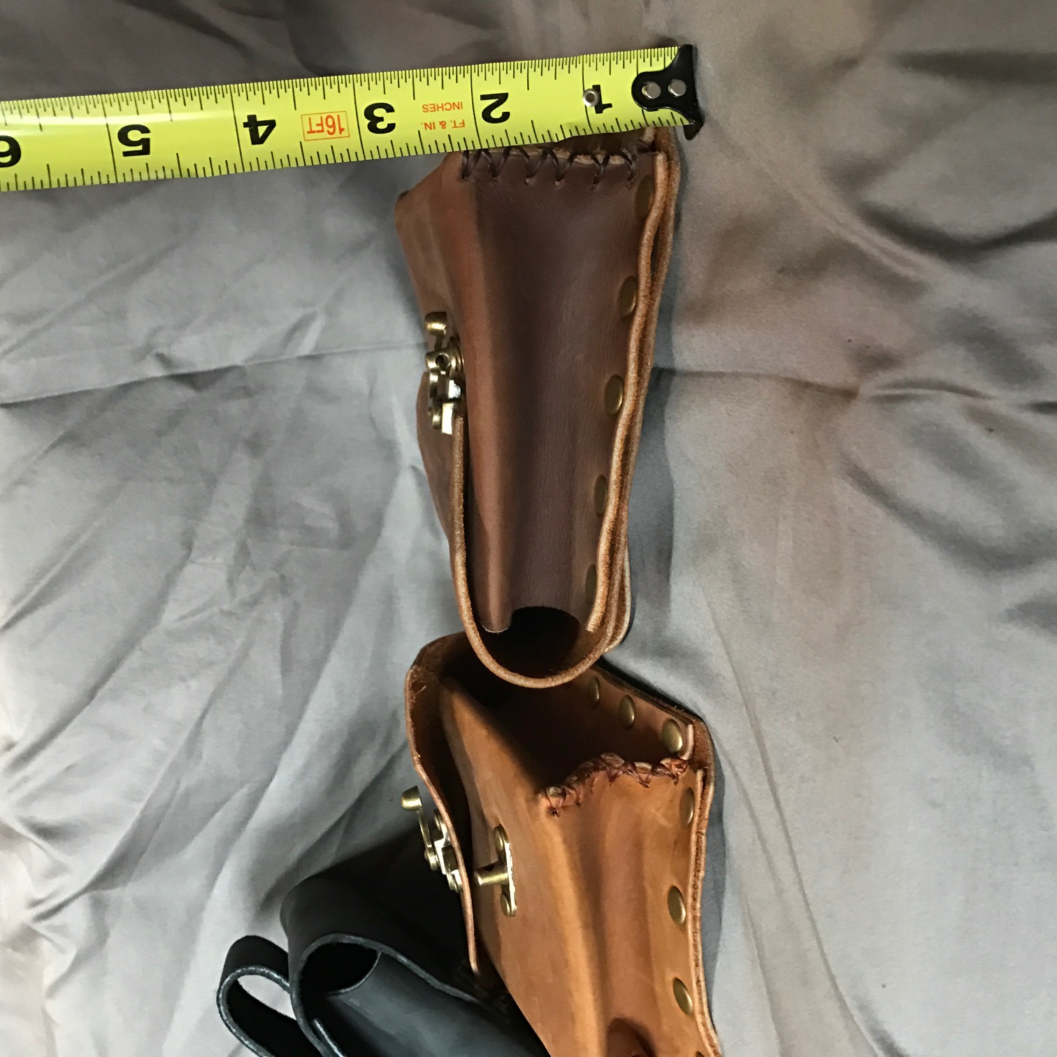 Handmade leather pouch that fits onto your belt. The pouch comes in black, black faux croc, dark brown, and light brown, all with rivets. There is a clasp closure on the front. The pouch measures about 5 inches wide.