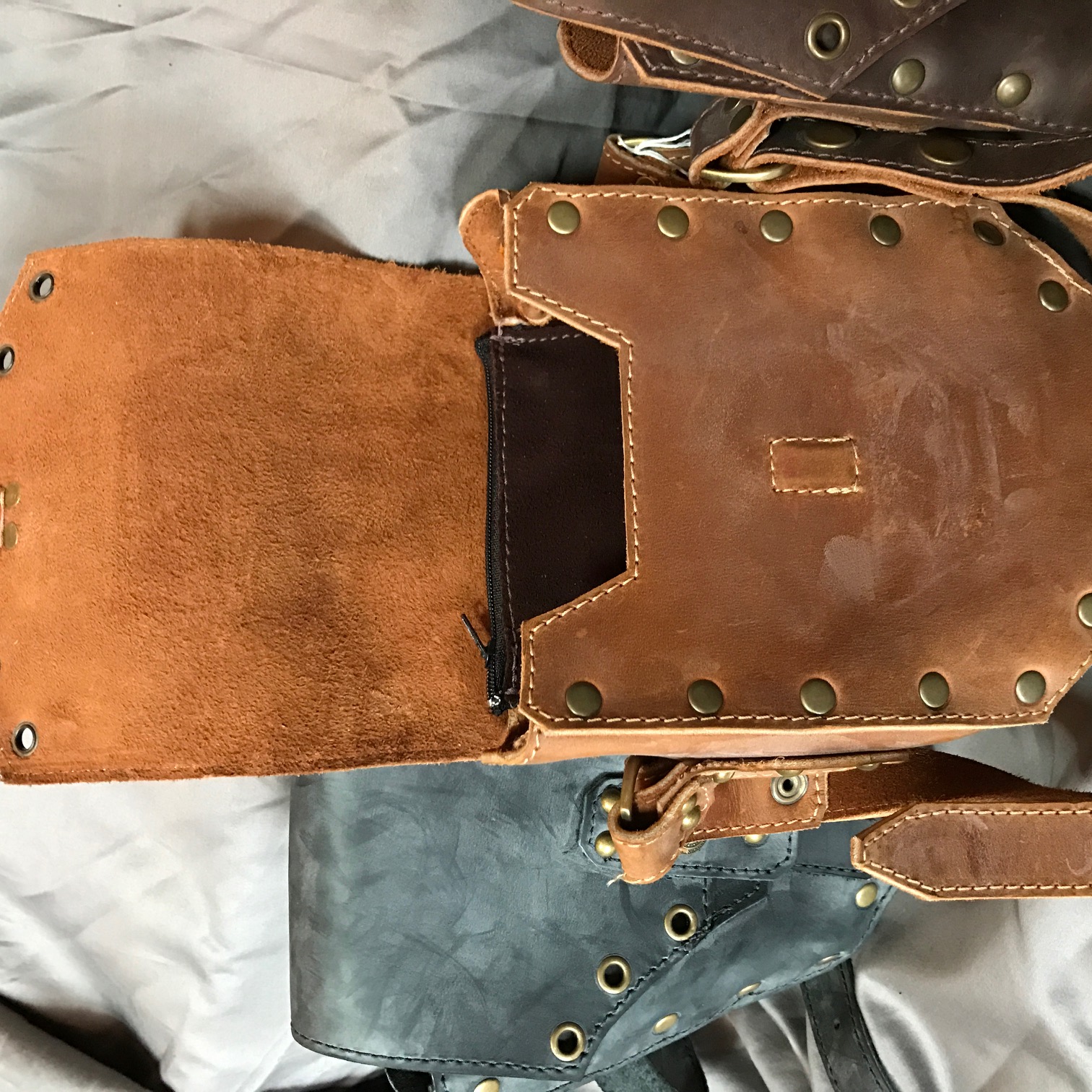A handmade leather bag. Each bag comes with an adjustable strap with a buckle. The strap has a snap closure on either side for easy removal if you wish. The bag also has two loops on the back for a belt attachment.