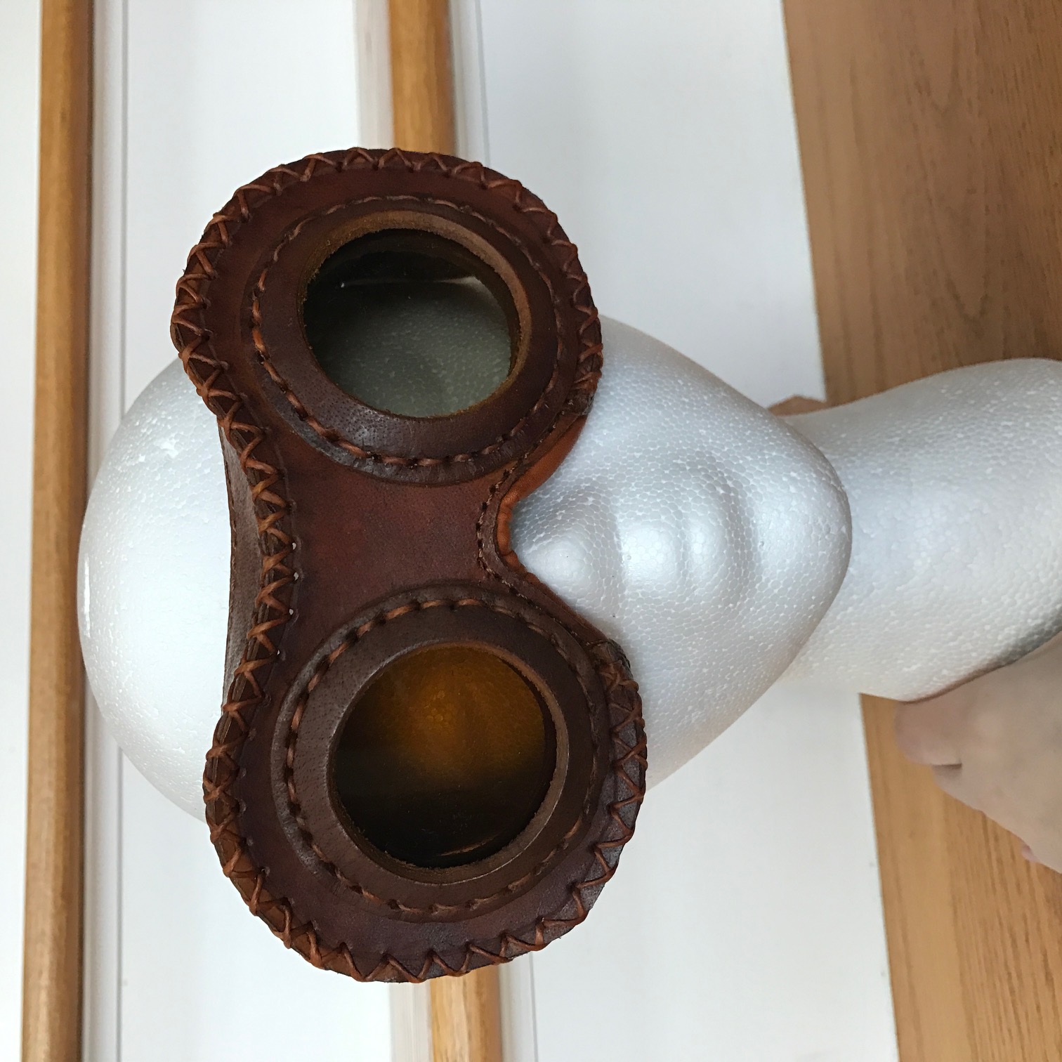 The goggles are made of leather and glass, with rivets and an adjustable strap with a buckle.