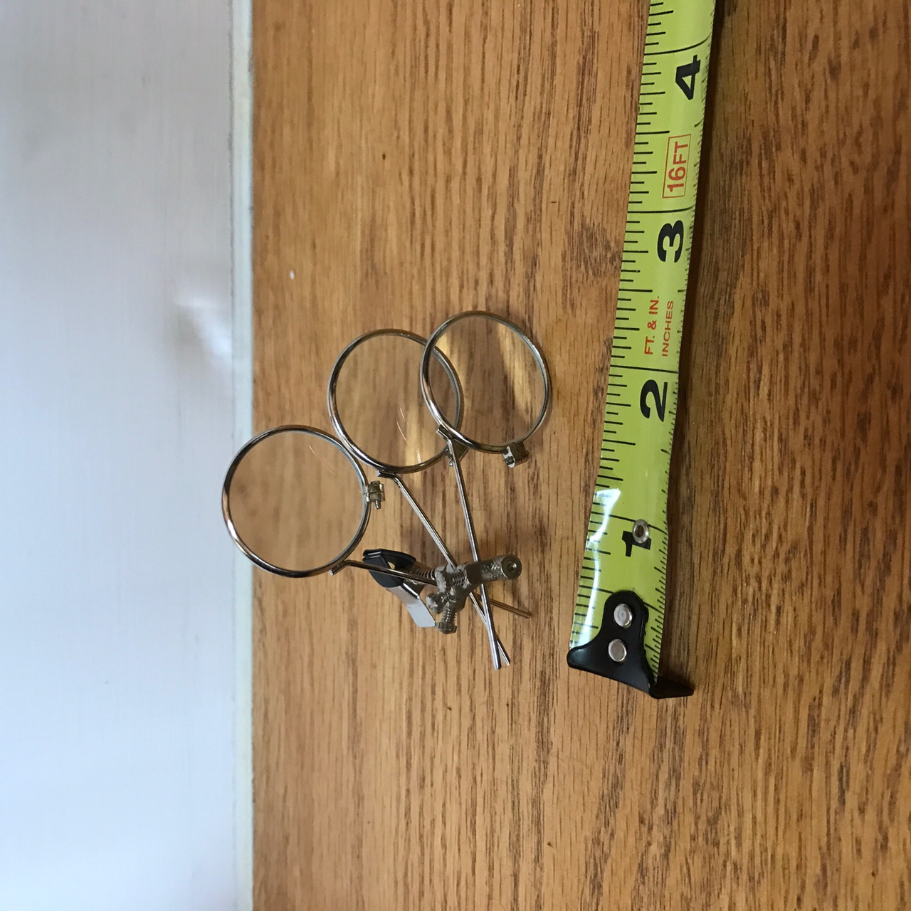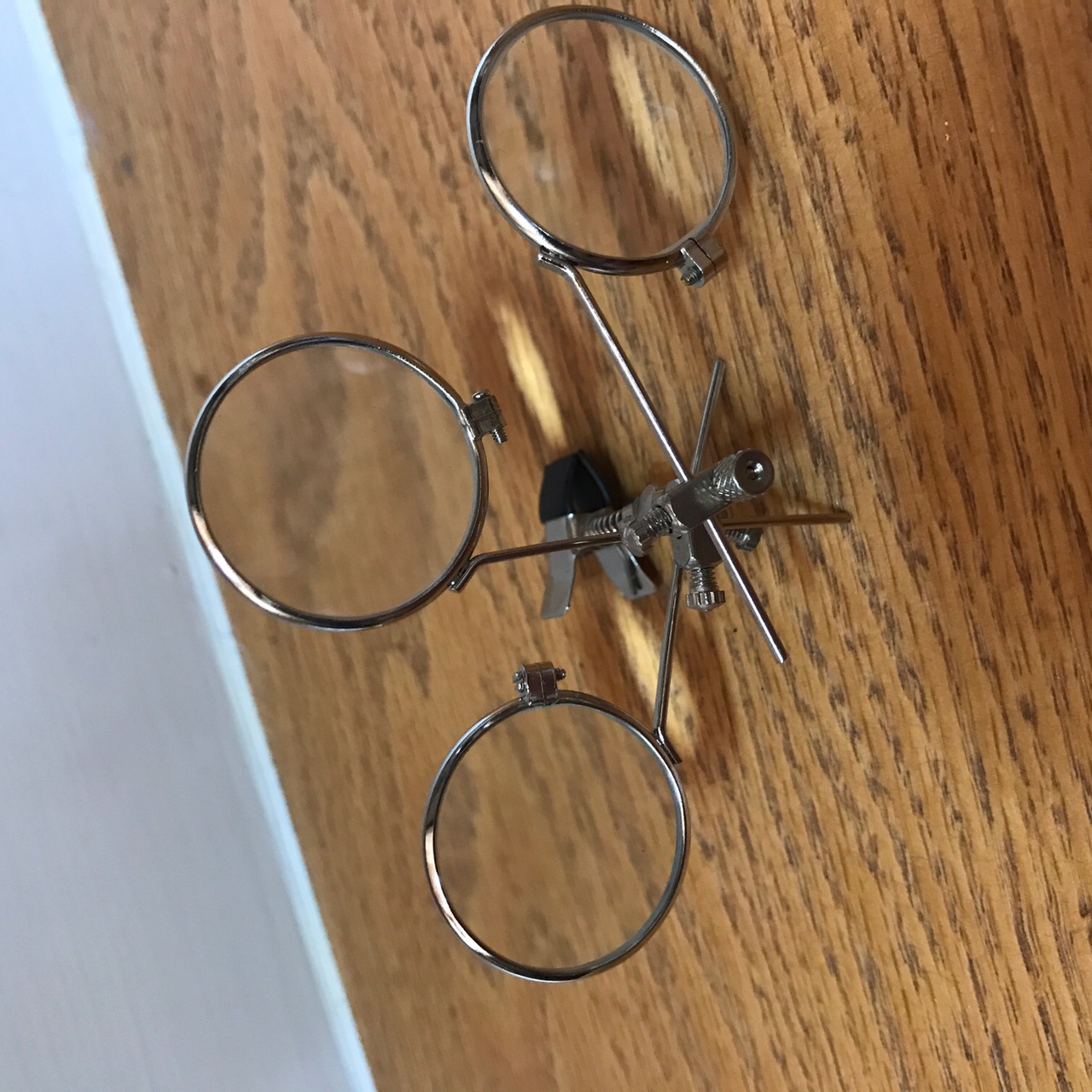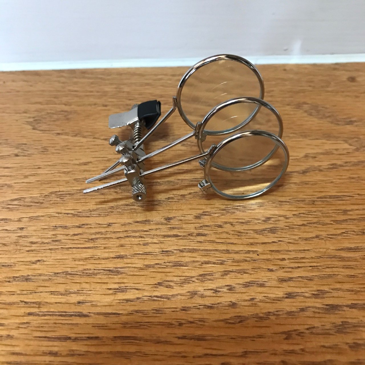 3-Loop magnifying lens set for eyeglasses or goggles. The loop is silver-colored and you can change the angles with levers. Each lens magnifies 3.3x.