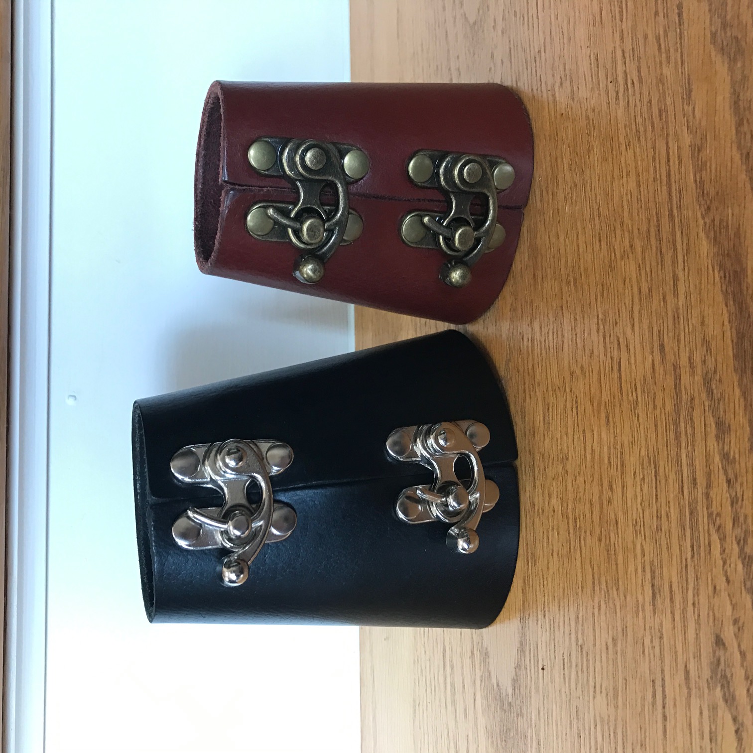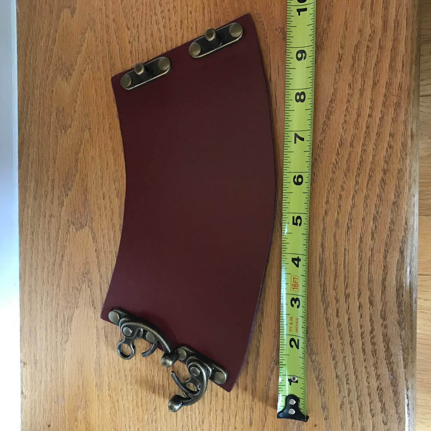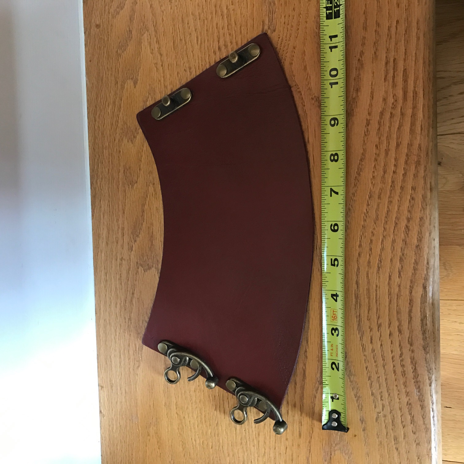 Single leather vambrace with clasp-style closures. The vambrace comes in black, light brown, dark brown, or reddish brown, and in large or small. Please see the pictures with the ruler for sizing.