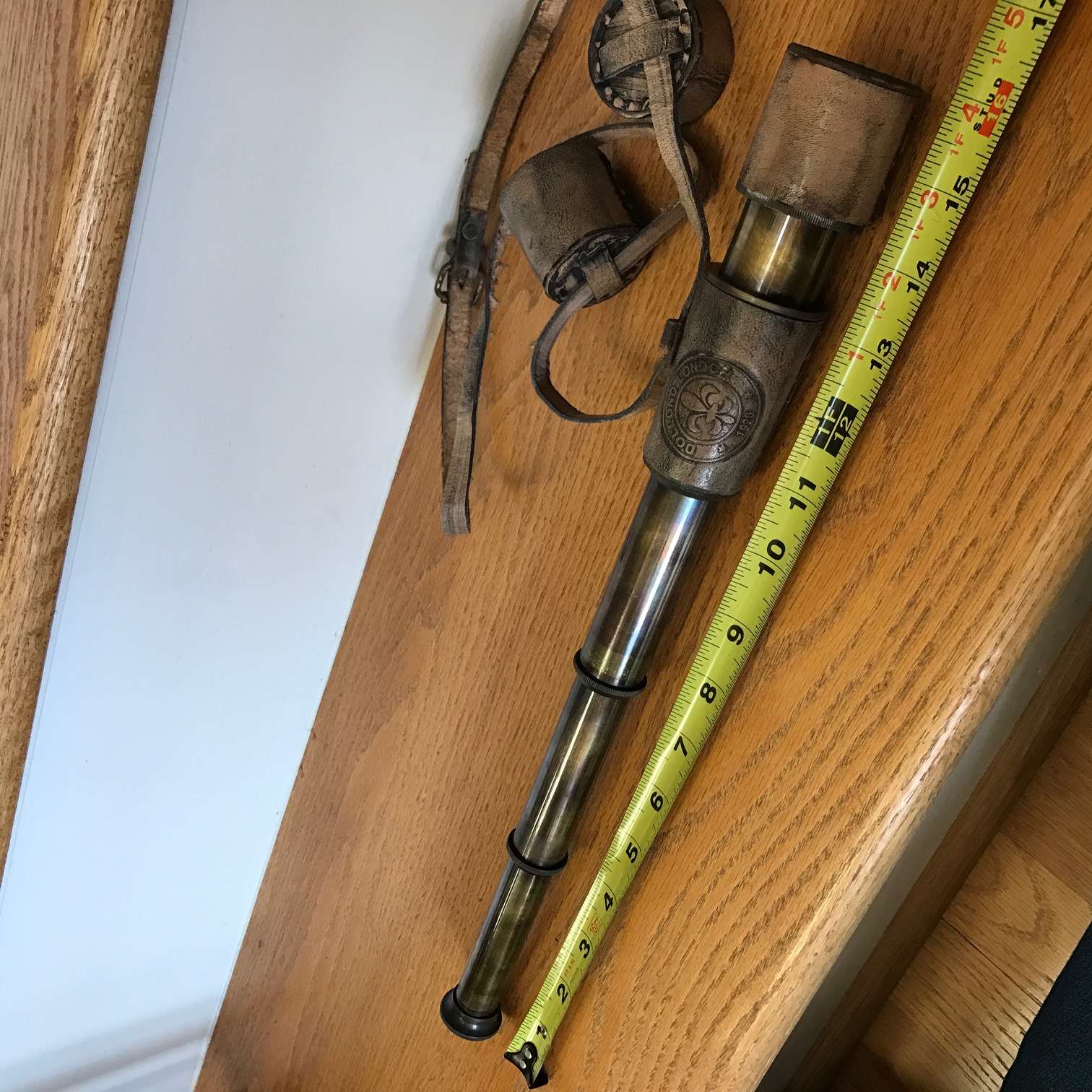 Leather wrapped antique-style telescope with end caps and a buckled strap.