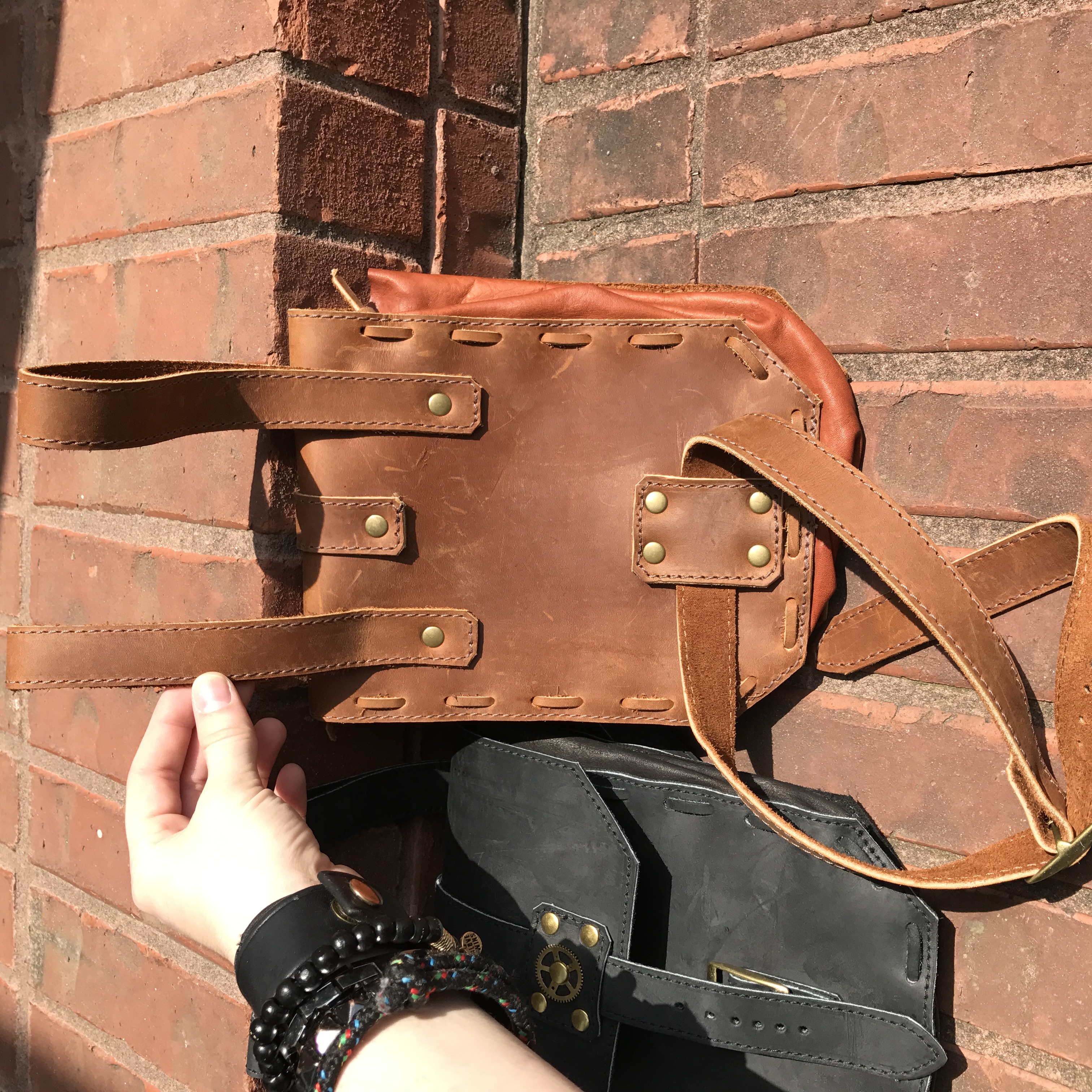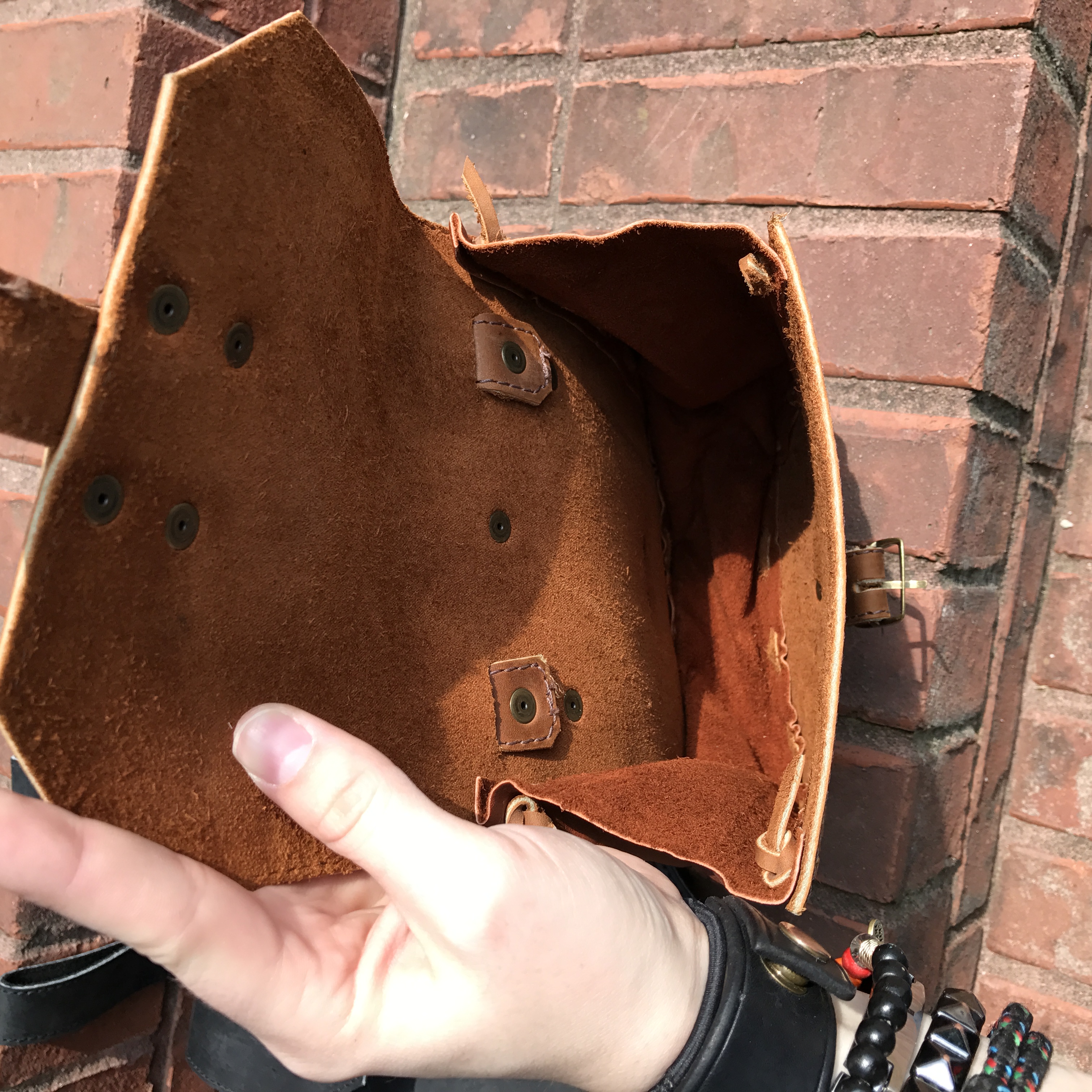 These handmade leather thigh bags are a perfect addition to any costume, or for use in everyday life! Each bag has long loops that can be fitted over any size belt, and a strap with a buckle closure that wraps around your thigh for extra security. The buckle strap has many holes for perfect sizing.