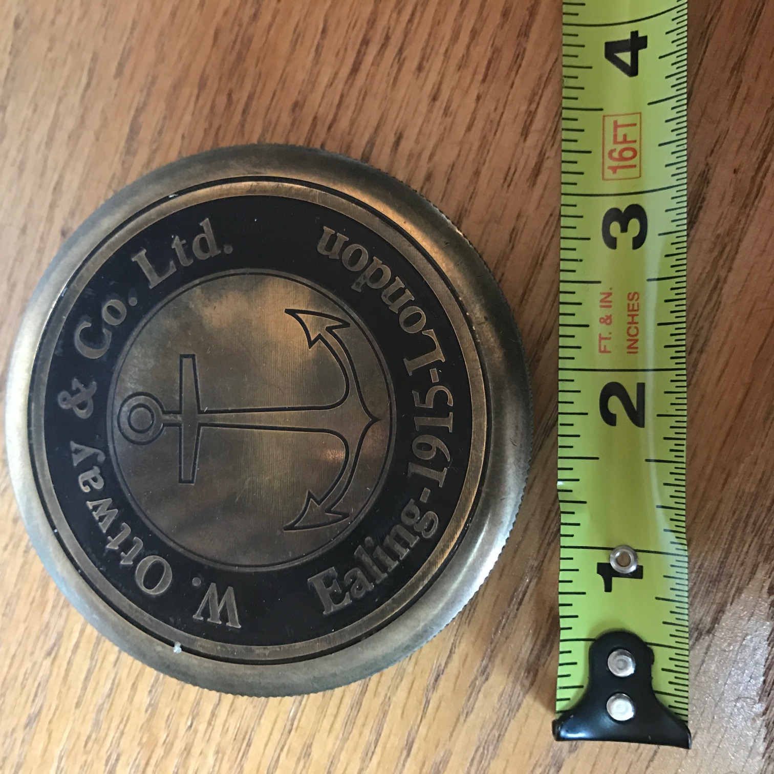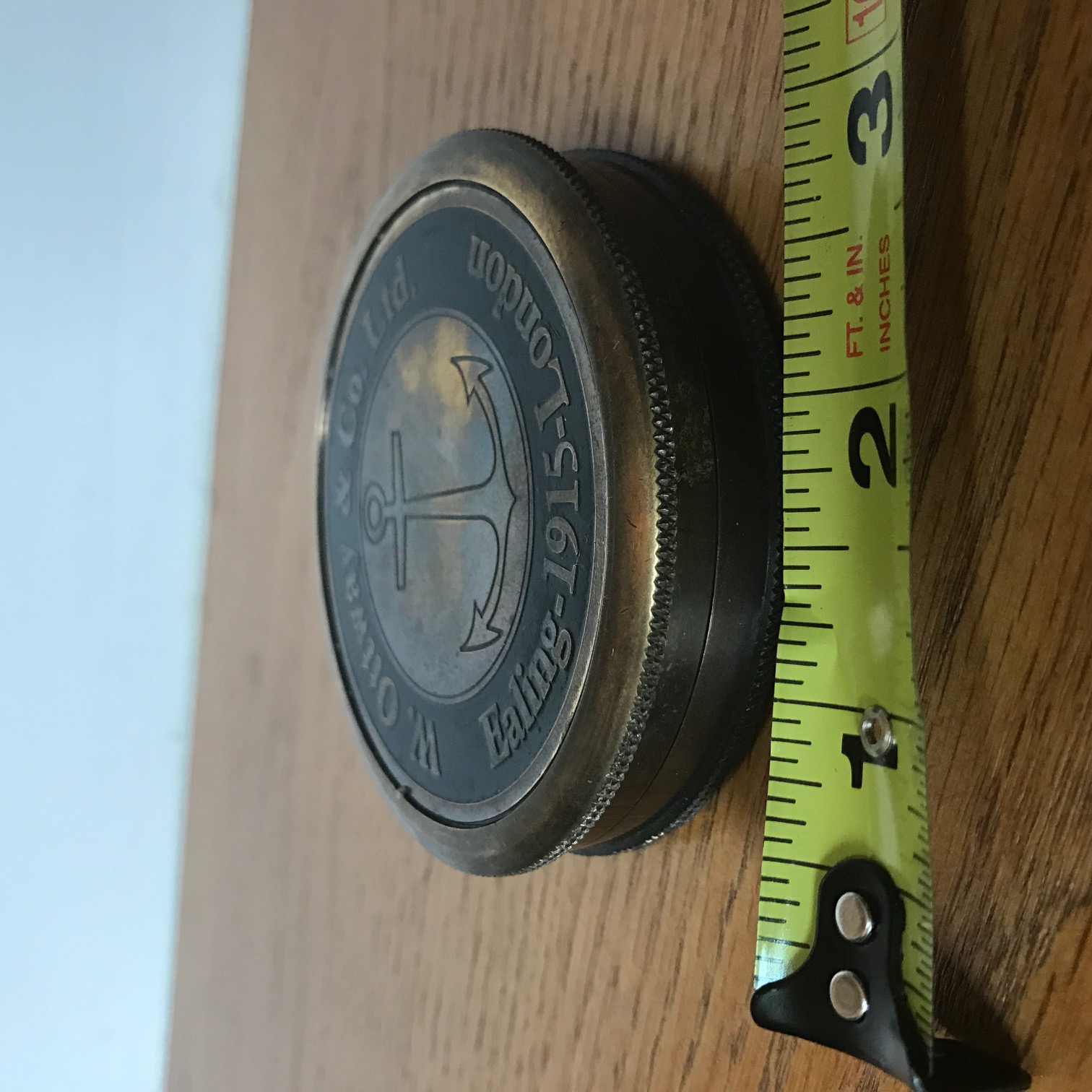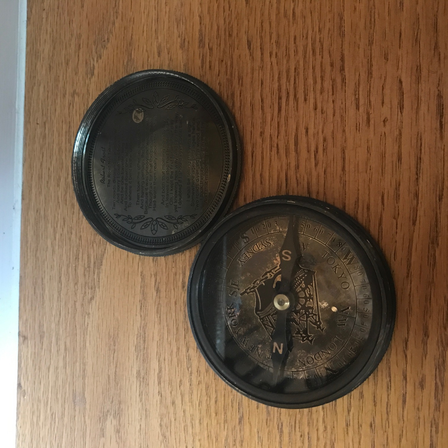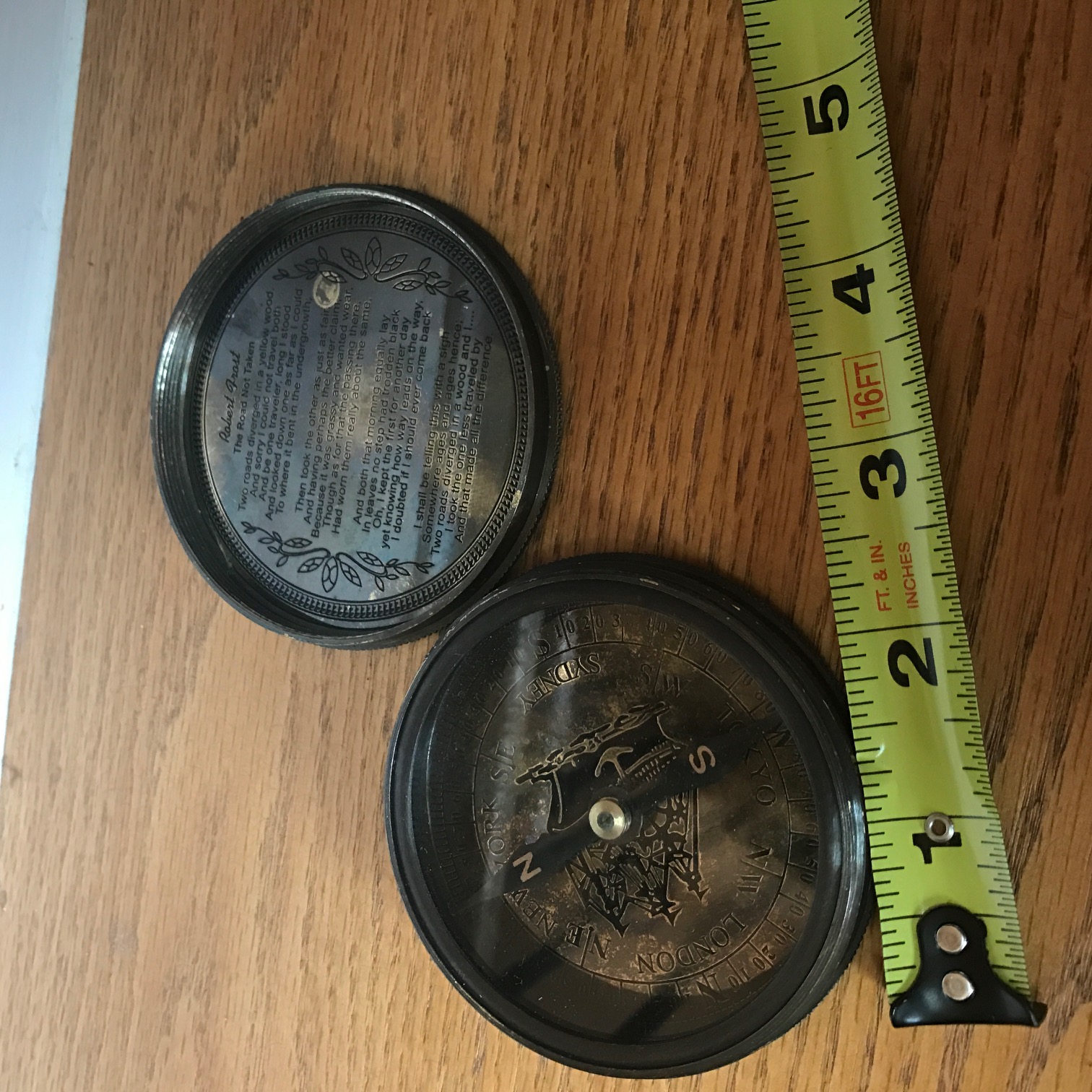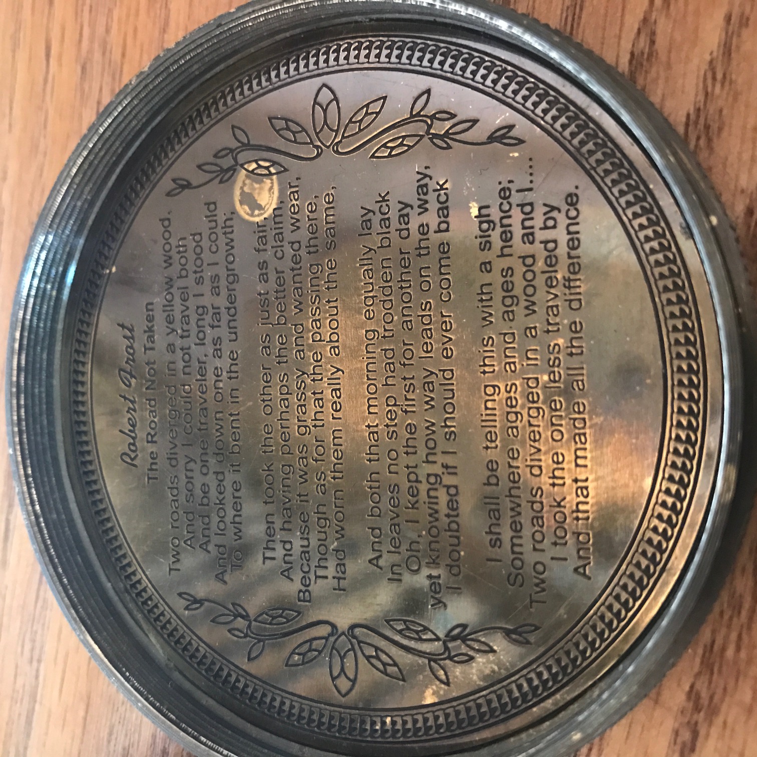 Antique replica screw-top working compass with lid. There is a poem by Robert Frost on the inside of the lid.