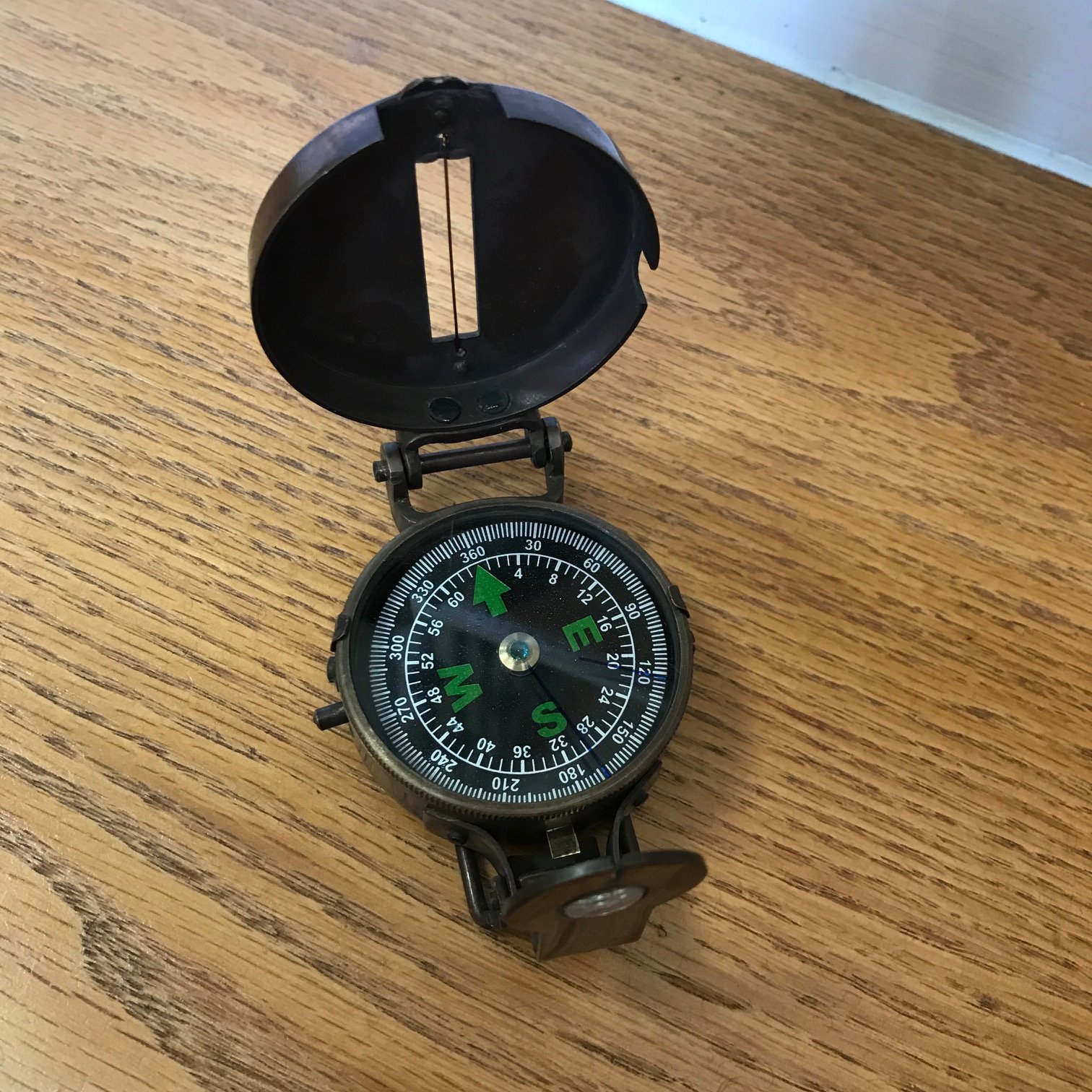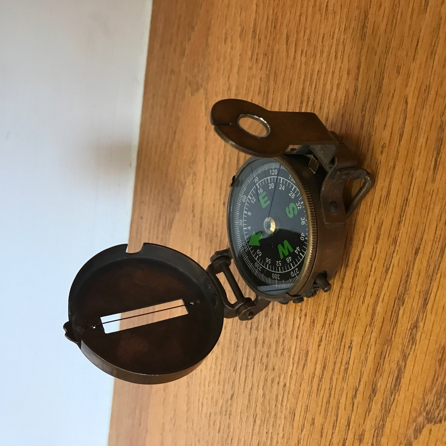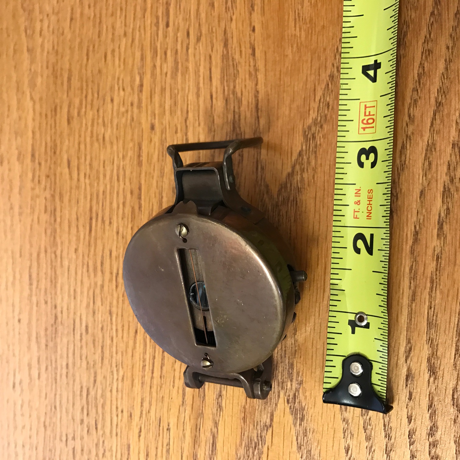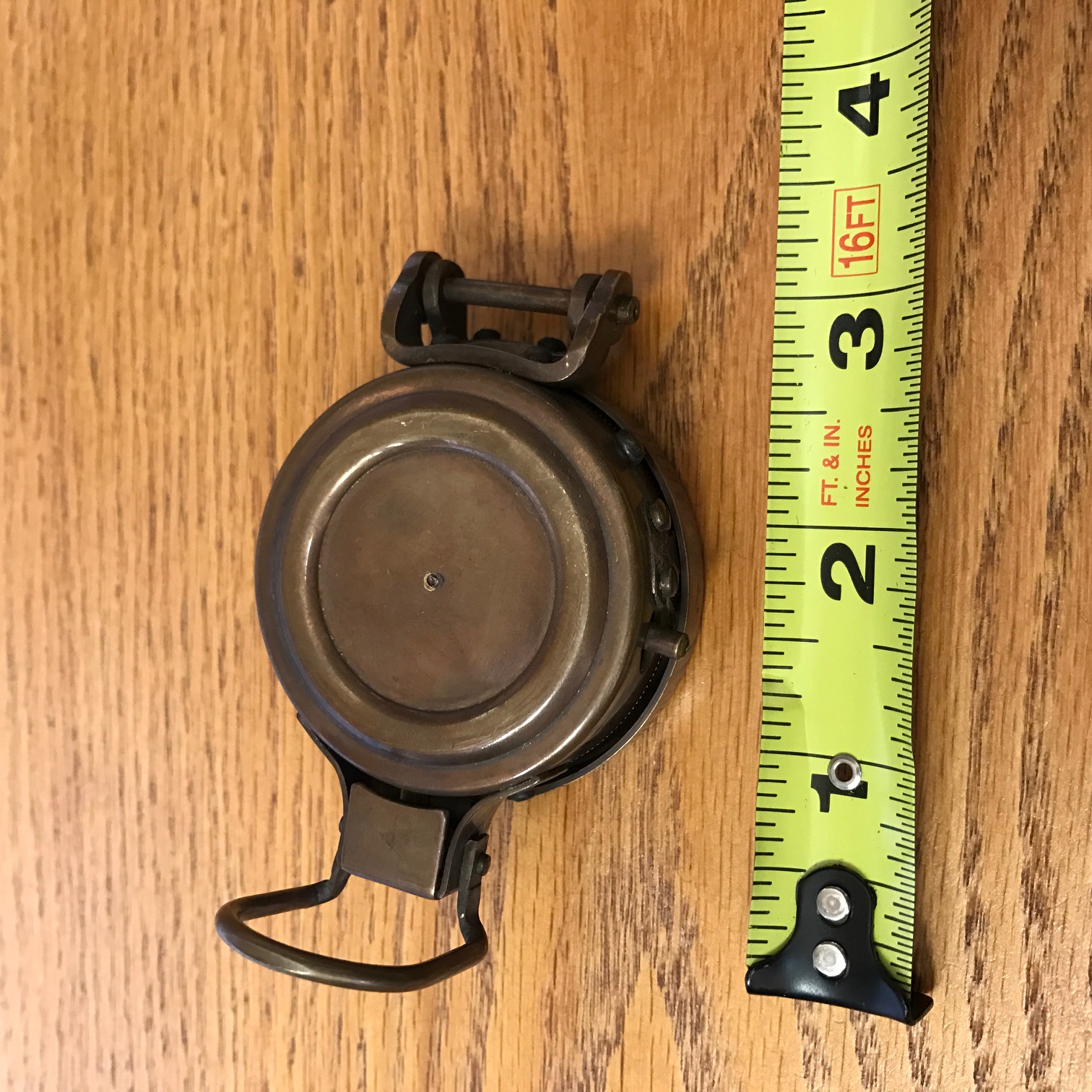 Round vintage style Brunton Compass. Some geologists still use this compass in the field! It folds shut to be compact, with a large loop to attach easily to a belt, backpack, or clip.