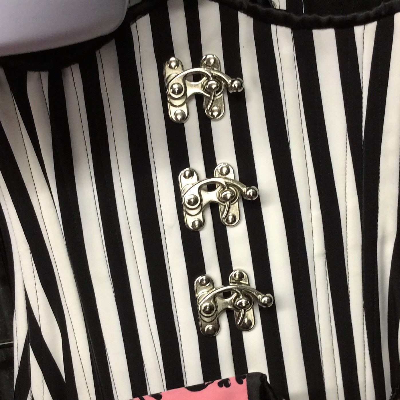 Our corsets have 20 spiral steel bones for comfort and form, and an additional 6 spring steel stays that support the grommets and busk. They have three layers of fabric (two inner layers of high-quality cotton twill for a breathable fit and wicking away any moisture, and an outer fashion fabric). The middle fabric layer is laminated to the outer fabric for added strength and a smoother finish. There is a waist tape for extra support at the waist line. The laces are extra long and very strong for a tight but comfortable fit.