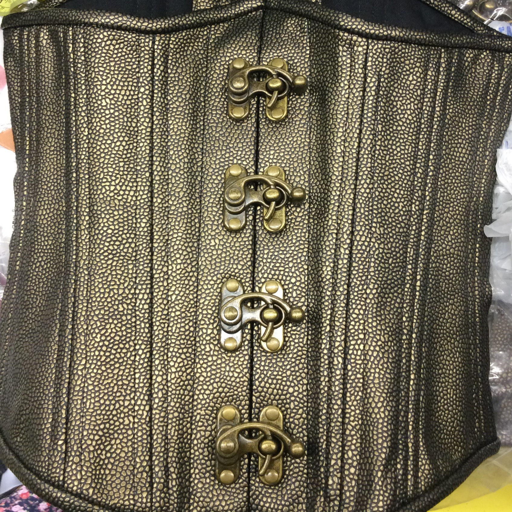 Our corsets have 20 spiral steel bones for comfort and form, and an additional 6 spring steel stays that support the grommets and busk. They have three layers of fabric (two inner layers of high-quality cotton twill for a breathable fit and wicking away any moisture, and an outer fashion fabric). The middle fabric layer is laminated to the outer fabric for added strength and a smoother finish. There is a waist tape for extra support at the waist line. The laces are extra long and very strong for a tight but comfortable fit.