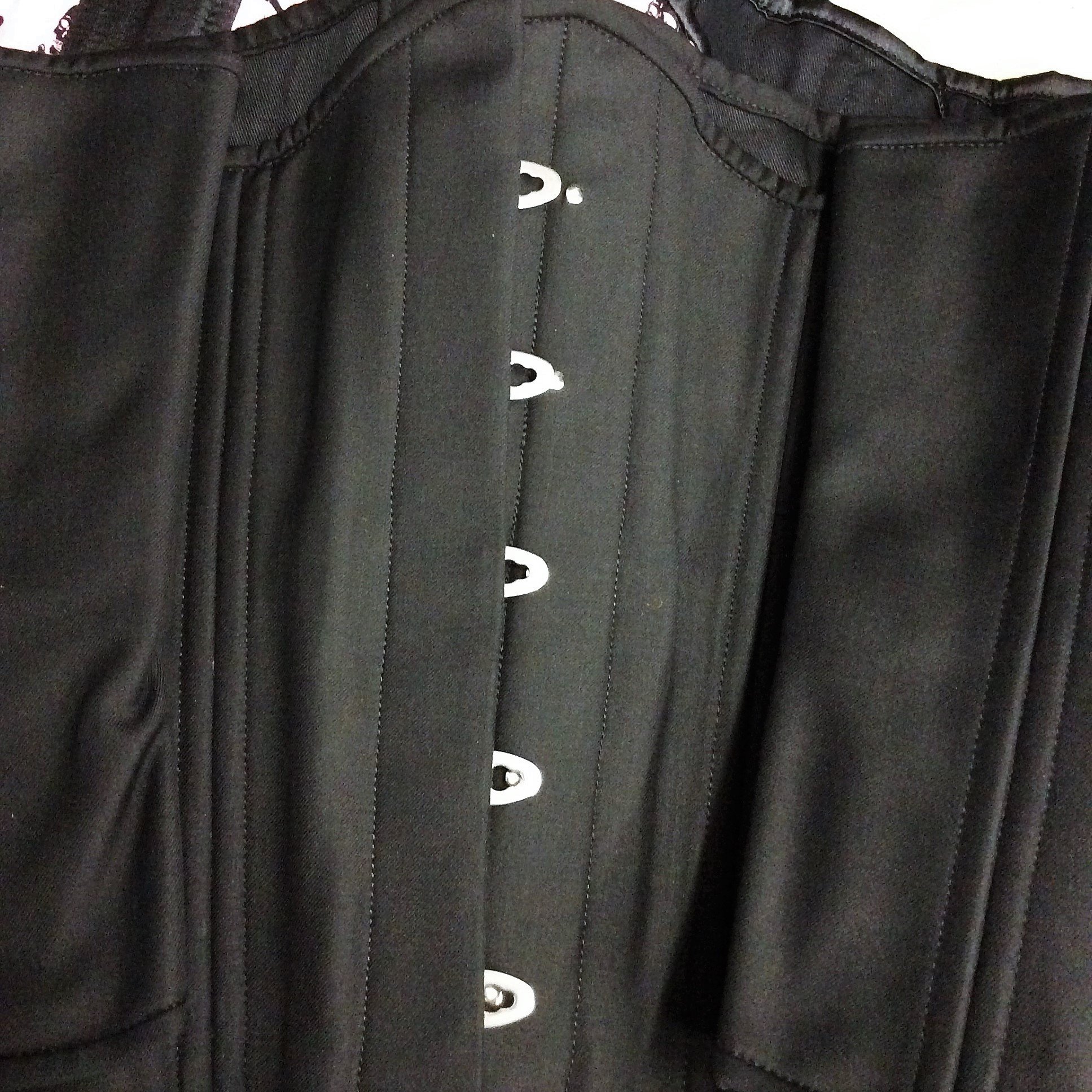 Our corsets have 20 spiral steel bones for comfort and form, and an additional 6 spring steel stays that support the grommets and busk. They have three layers of fabric (two inner layers of high-quality cotton twill for a breathable fit and wicking away any moisture, and an outer fashion fabric). The middle fabric layer is laminated to the outer fabric for added strength and a smoother finish. There is a waist tape for extra support at the waist line. The laces are extra long and very strong for a tight but comfortable fit.