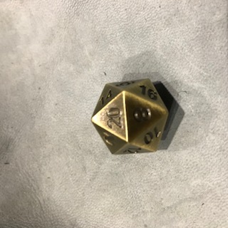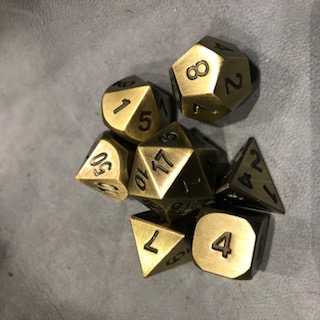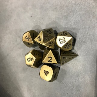 This set of dice includes 7 standard D&D dice in an antiqued brass.