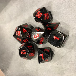 This set of dice includes 7 standard D&D dice in a shiny black metal with red enamel numbers.